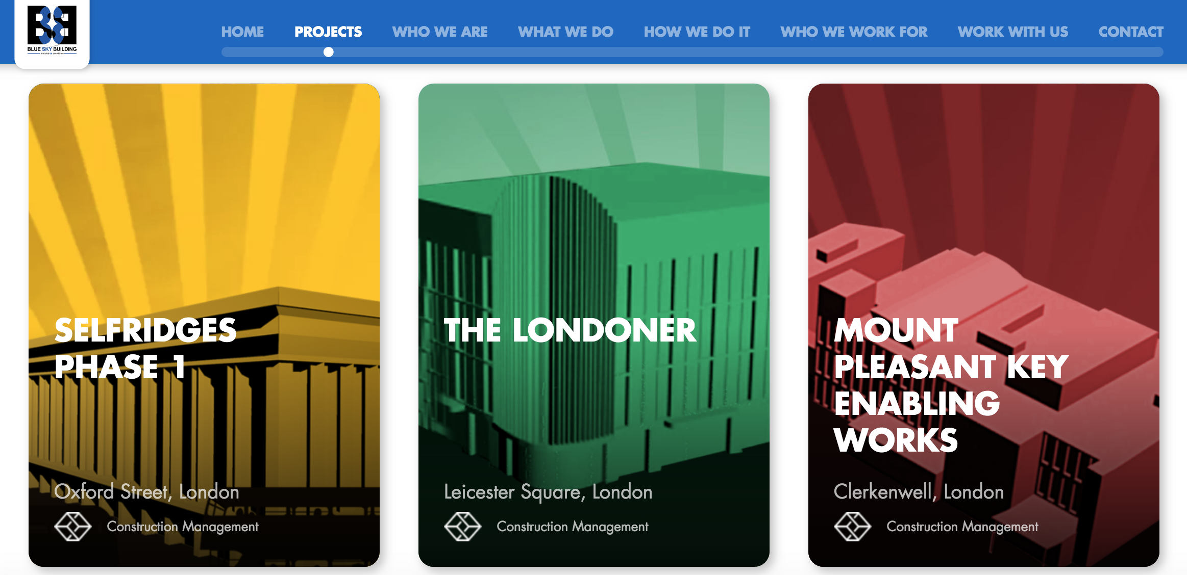 Blue Sky Building specialise in construction, consultancy services and project management within the built environment. The new site features a clean design, with the colour palette taking inspiration from the Blue Sky Building logo - predominantly blue, grey and white. In contrast to this, bright colours are used to draw users attention to key areas. Throughout the site, hero images act as a showcase of the work that Blue Sky Building have completed.