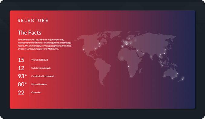 Working globally in 22 countries, Selecture Global has hubs in London, Singapore and Australia. The team prides itself on building long-term partnerships based on trust. It works in four core industry areas of consulting, technology, financial services and leadership. Some of the most respected and leading businesses in the world work with Selecture Global including PWC, Boston Consulting Group, Vodafone, Aviva, Deloitte.