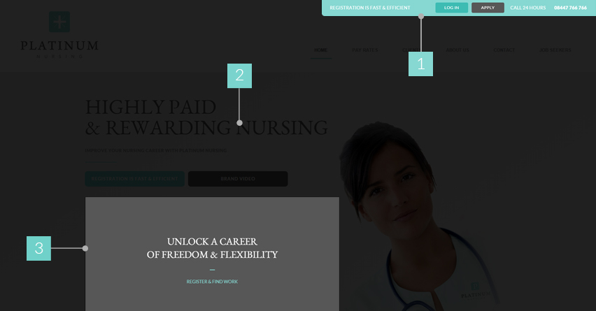 Sleekly formed around the company’s brand, the Platinum Nursing website has been designed to breathe freshness into the healthcare recruitment market, and is a great example of brand transcendence in the internet environment.